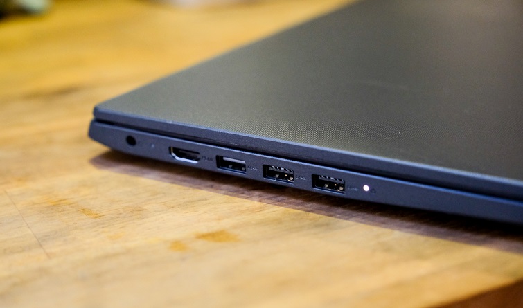 Cạnh phải của laptop là cổng nguồn, 1 cổng HDMI tiêu chuẩn, 3 cổng USB 3.0 Type-A.