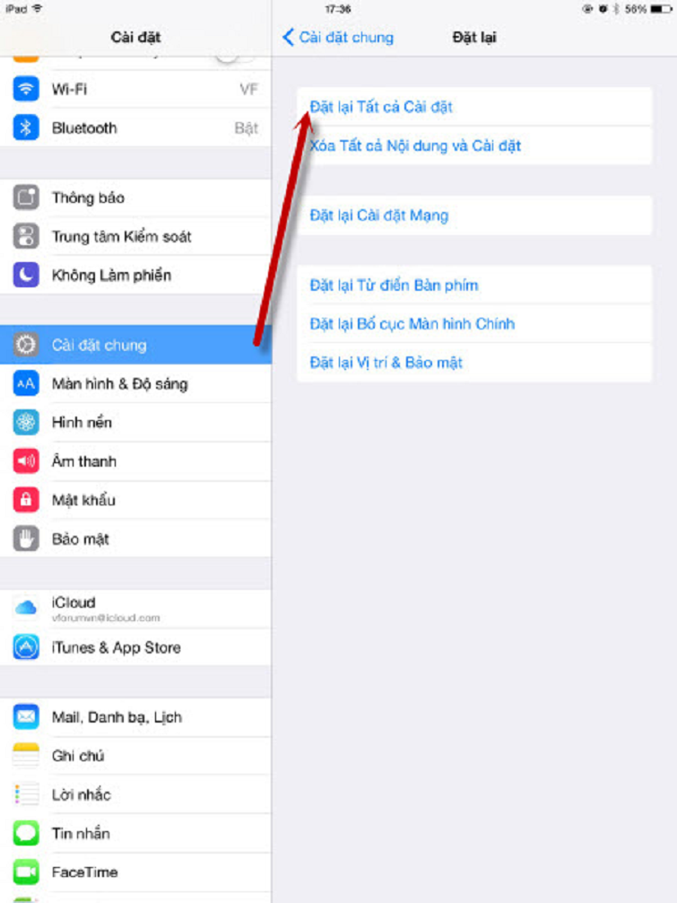 Chuyển đến Cài đặt => Chọn Cài đặt chung => Tiếp tục chọn Đặt lại => Sau đó chọn Xóa tất cả nội dung và cài đặt. Tại thời điểm này, bạn chỉ cần đợi máy thực hiện khôi phục.