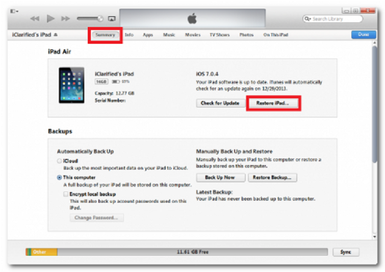 Trên giao diện iTunes, chọn Tab Summary => Chọn Restore iPad. ITunes sẽ tự động tải xuống iOS mới nhất và khôi phục thiết bị. Chỉ cần đợi cho đến khi quá trình Khôi phục iPad hoàn tất. Sau đó kiểm tra xem màn hình iPad có nhiễu màu hay không.