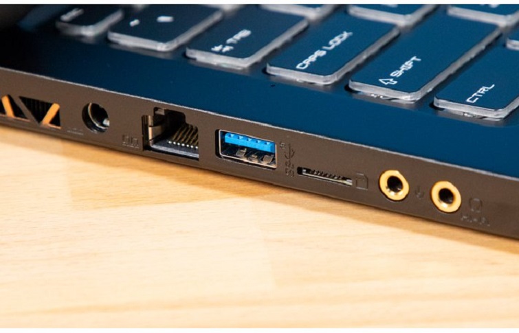 Cổng I/O bao gồm: khe đọc thẻ nhớ, đầu ra HDMI, cổng RJ45, cổng Thunderbolt 3, nguồn, jack cắm tai nghe, cổng USB 3.2 gen 1 Type C và 3 cổng USB 3.2 gen 2 Type A.