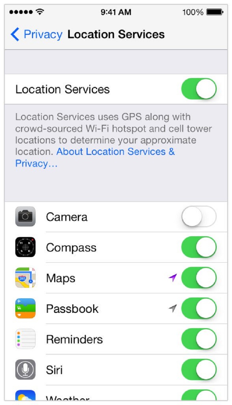 Tắt dịch vụ định vị của Camera bằng cách đi tới Setting (Cài đặt)> Privacy (bảo mật) đến Location Services (Dịch vụ định vị).