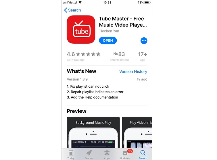 - Bước 1: Tải ứng dụng Tube Master từ App Store bằng cách tìm kiếm "Tube Master - Free Music Video Player for YouTube". Đảm bảo chọn phiên bản chính thức từ nhà phát triển Xian Hu để tránh phần mềm giả mạo.