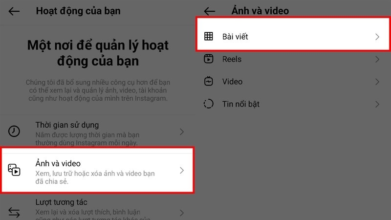 Bước 3: Chọn "Ảnh và video" → "Bài viết" (Posts).