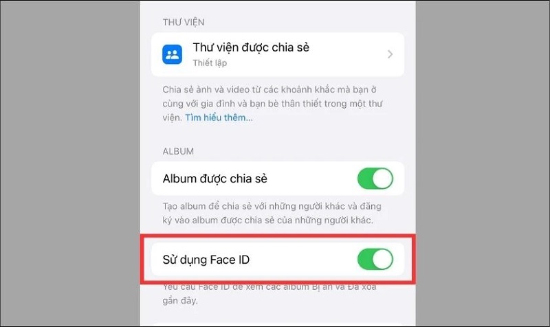 Bước 2: Tại giao diện mới hiển thị, bạn có thể cài đặt bảo mật dành cho Album ảnh đã xóa gần đây và Album ảnh bị ẩn trên thiết bị bằng cách gạt thanh trượt ở mục Sử dụng Face ID sang phải.