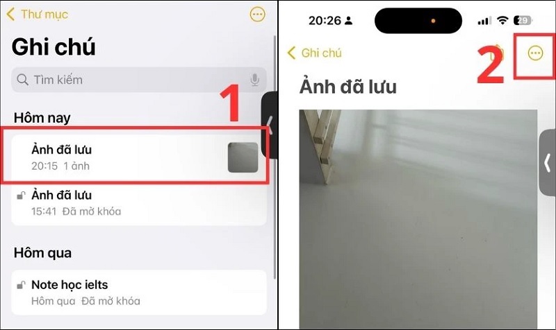 Bước 4: Tại màn hình chính điện thoại, bạn mở ứng dụng Ghi chú lên. Lúc này, bạn hãy nhấn vào hình ảnh đã được lưu rồi nhấn vào biểu tượng dấu 3 chấm.
