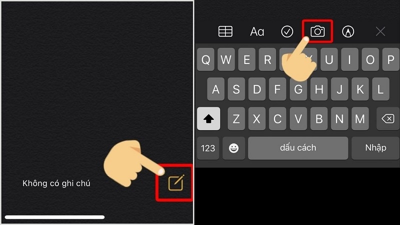 - Bước 1: Mở ứng dụng Ghi chú trên iPhone của bạn. Nếu chưa có ghi chú nào, hãy tạo mới bằng cách nhấn vào biểu tượng bút chì ở góc dưới bên phải. Trong giao diện soạn thảo, chọn biểu tượng camera (thường nằm ở thanh công cụ phía dưới).