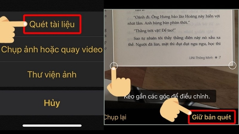 - Bước 3: Từ menu hiện ra, chọn "Quét tài liệu" (Scan Documents). Hướng camera vào tài liệu cần quét. Hệ thống sẽ tự động nhận diện khung tài liệu (hiển thị viền vàng) và chụp ảnh. Bạn có thể quét nhiều trang liên tiếp bằng cách tiếp tục hướng camera vào trang tiếp theo.