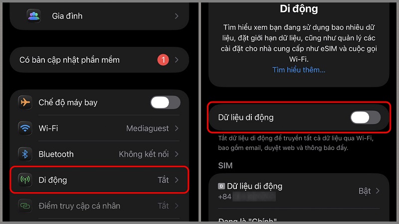 Bật dữ liệu di động: Cài đặt → Di động → gạt Dữ liệu di động sang phải
