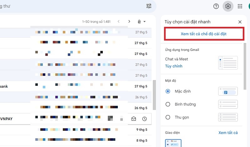 Mở Gmail trên trình duyệt web (khuyến nghị sử dụng Chrome để có trải nghiệm tốt nhất). Nhấp vào biểu tượng bánh răng ở góc phải màn hình, sau đó chọn "Xem tất cả cài đặt".