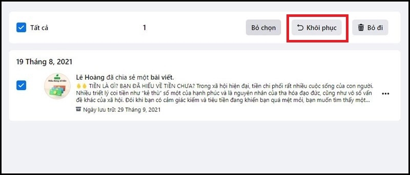 Bước 3: Tìm bài viết và nhấn "Khôi phục".