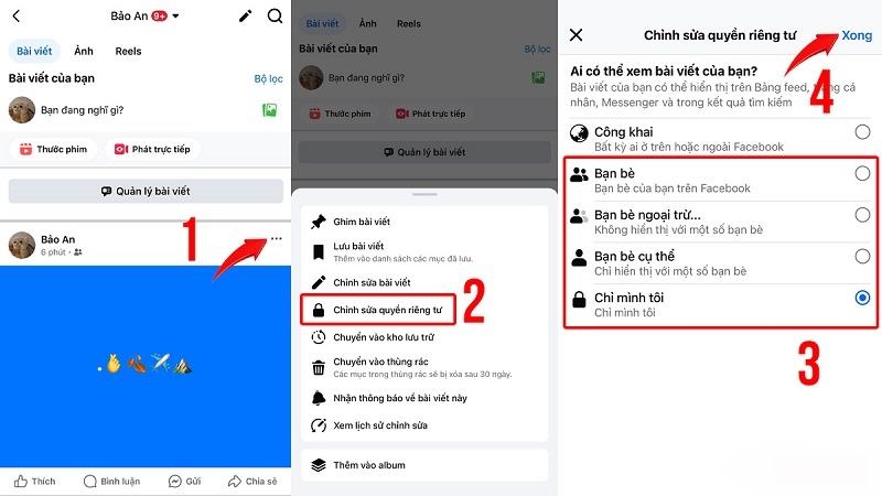 Cách này đơn giản, nhanh chóng, cho phép ẩn bài viết khỏi dòng thời gian công khai mà vẫn giữ nguyên nội dung. Đặc biệt hữu ích khi muốn ẩn tạm thời hoặc chỉ cho phép bản thân xem.