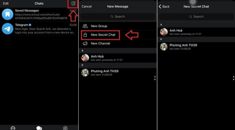 Bước 2: Nhấn vào ba chấm (Android) hoặc tên người dùng (iOS), chọn "New Secret Chat".
