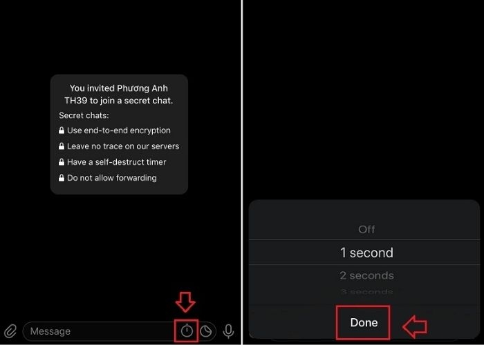 Bước 5: Chọn thời gian tự hủy từ 1 giây đến 1 tuần. Sau khi người nhận đọc, tin nhắn sẽ tự động xóa sau khoảng thời gian này.