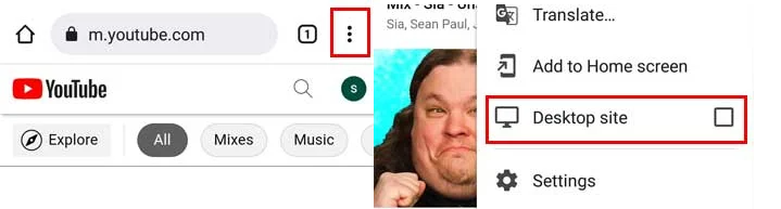 Gõ m.youtube.com vào thanh địa chỉ. Sau khi trang tải, nhấn vào biểu tượng ba chấm ở góc trên bên phải và chọn Trang web cho máy tính (Desktop site).