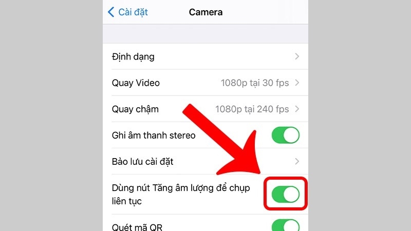 Bước 2: Tại giao diện Camera mới hiển thị, bạn tìm kiếm và gạt thanh trượt ở mục Dùng nút tăng âm lượng để chụp liên tục sang phải để kích hoạt tính năng thành công.