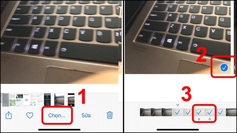 Bước 4: Lúc này, bạn hãy nhấn vào hình ảnh thu nhỏ nằm bên dưới của ảnh chụp liên tục vừa thực hiện. Sau đó, nhấn vào tùy chọn Chọn... Đối với những hình ảnh bạn muốn giữ lại, hãy đánh dấu tích vào góc dưới bên phải hình ảnh.