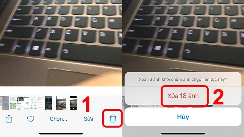 Đối với trường hợp những hình ảnh chụp liên tục trên iPhone bạn vừa thực hiện không được ưng ý, bạn hãy mở hình chụp liên tục lên rồi nhấn vào biểu tượng Thùng rác >> Chọn Xóa để hoàn tất.