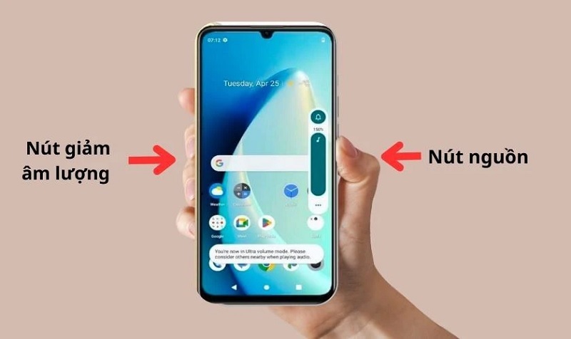 Ấn giữ cùng lúc vào nút nguồn và phím giảm âm lượng