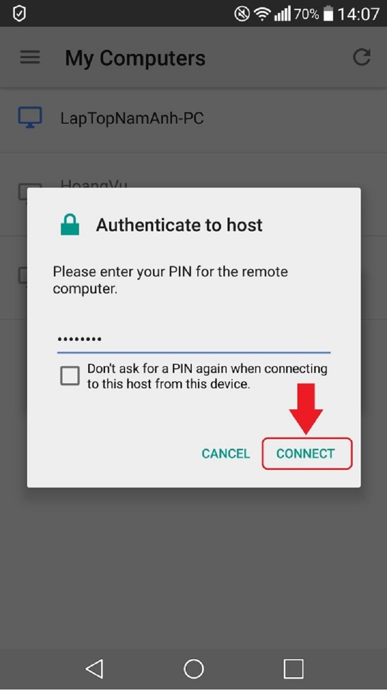 Bạn tiếp tục nhấn vào ô Laptop bạn chọn để kết nối. Sau đó, bạn nhập mã PIN đã được thiết lập trên laptop và chọn vào CONNECT.