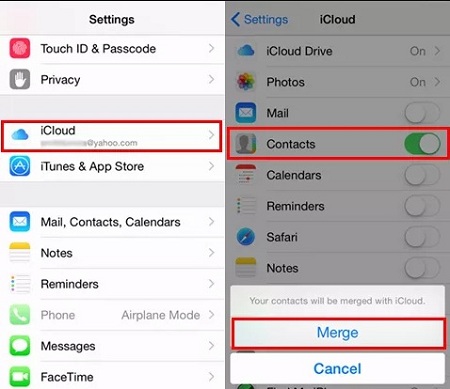 1. Tương tự như trên, trên iPhone, điều hướng đến Settings (Cài đặt), sau đó nhập tên và sau đó nhấn iCloud để bật Contacts (Danh bạ) với sự trợ giúp của thanh trượt bạn hãy gạt sang chế độ bật.