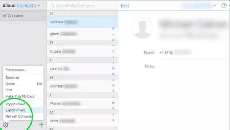 4. Nhấn biểu tượng bánh răng Export vCard.