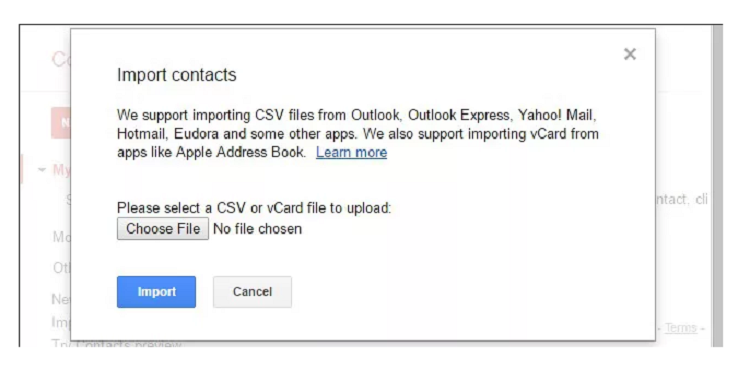 5. Bây giờ, điều hướng và đăng nhập vào Google Contacts. 6. Chỉ cần chạm vào Import Contacts ở bên trái và nhấn "Choose File" để chọn tệp.