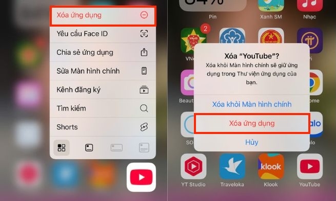 - Giữ biểu tượng YouTube trên màn hình chính