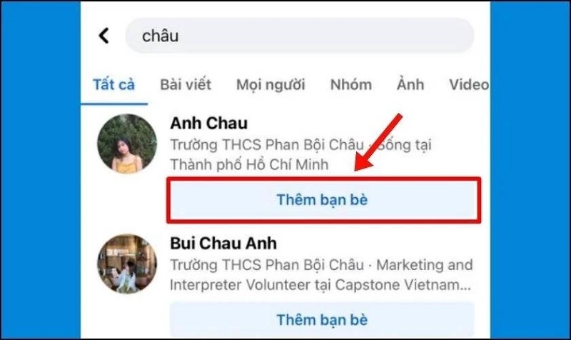 Bước 2: Kết quả tìm kiếm sẽ hiển thị danh sách các tài khoản liên quan. Chuyển sang tab Mọi người để lọc danh sách người dùng. Sau đó, nhấn vào biểu tượng Thêm bạn bè bên cạnh tài khoản bạn muốn gửi lời mời kết bạn.