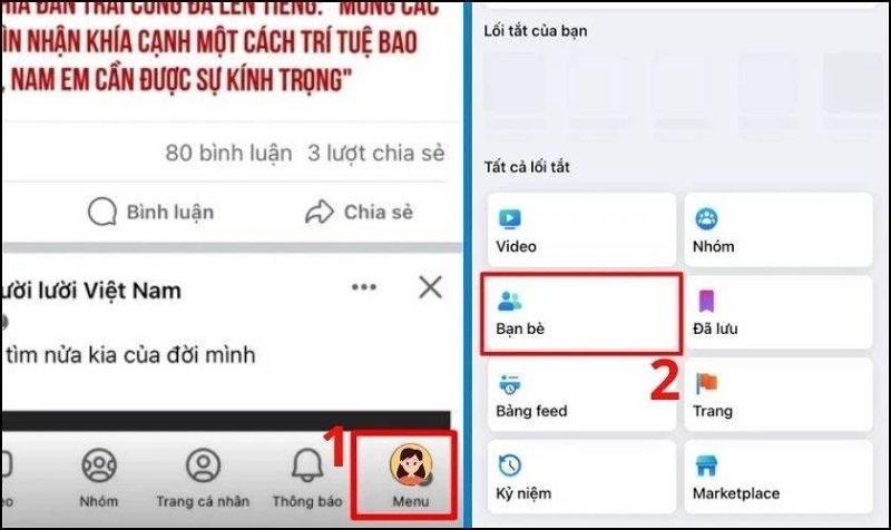 Bước 1: Mở ứng dụng Facebook, nhấn vào biểu tượng menu (3 dấu gạch ngang) và chọn mục Bạn bè.
