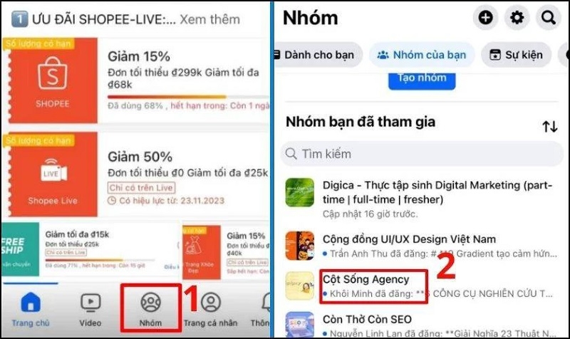 Chọn vào mục Nhóm của bạn hoặc chọn vào Trang đã thích