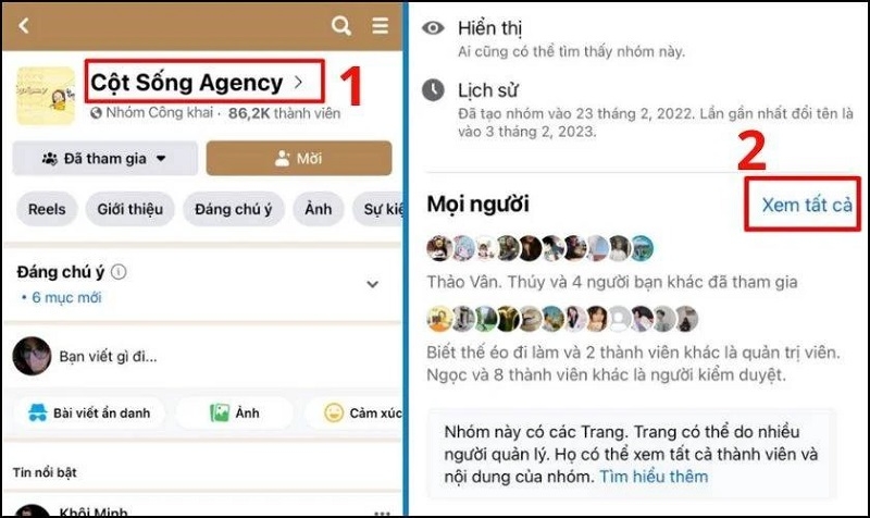 Bước 3: Tại giao diện nhóm, nhấn vào số lượng thành viên hoặc mục Thành viên và chọn Xem tất cả. Đối với Fanpage, bạn có thể tìm kiếm qua danh sách người thích hoặc bình luận trên bài viết.