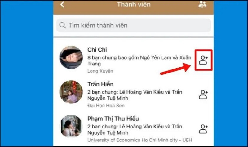 Bước 4: Cuộn danh sách thành viên và nhấn vào biểu tượng Thêm bạn bè bên cạnh tài khoản bạn muốn kết nối.