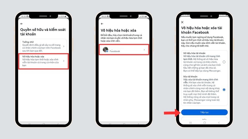 Bước 4: Chọn "Vô hiệu hóa tài khoản" và nhấn "Tiếp tục".