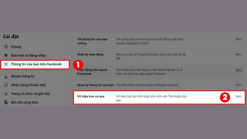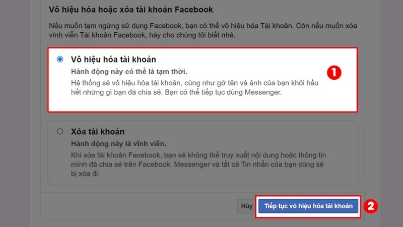 Nhấn vào mục này, Facebook sẽ hiển thị hai lựa chọn: "Vô hiệu hóa tài khoản" và "Xóa tài khoản vĩnh viễn".