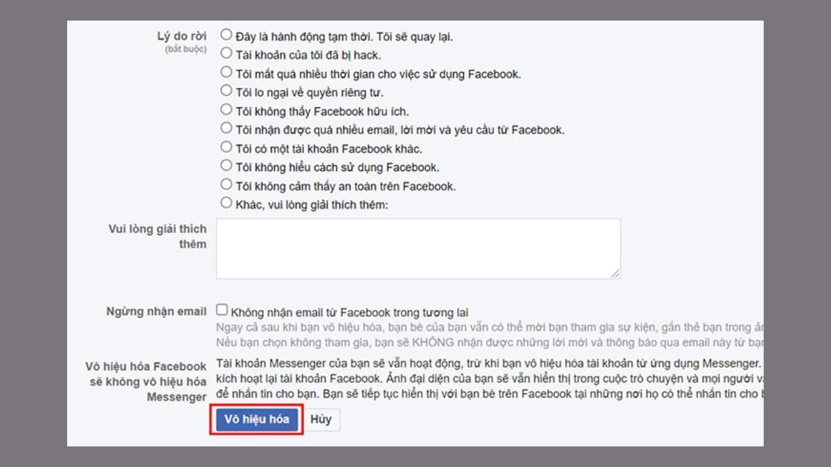 Chọn lý do vô hiệu hóa, nhấn "Vô hiệu hóa"