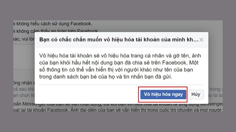 Bước 5: Cuối cùng, chọn Vô hiệu hóa ngay trên Facebook để hoàn tất cách thực hiện.