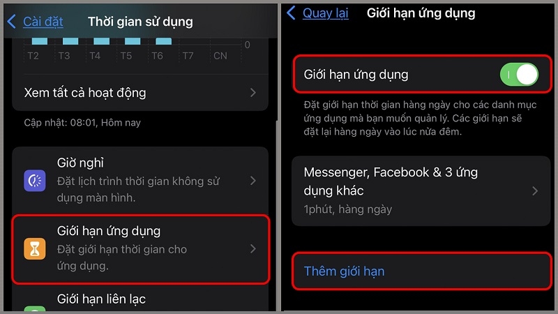 Bước 1: Vào Cài đặt > Thời gian Sử dụng > Giới Hạn Ứng Dụng