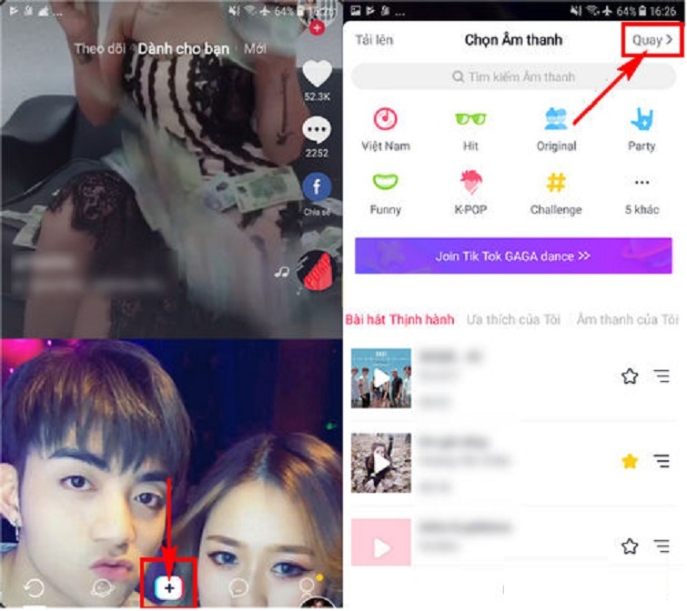 Bước 3 : Tại giao diện của ứng dụng Tik Tok, bạn sẽ lần lượt lựa chọn vào biểu tượng dấu "+" rồi chọn mục Quay để có thể bắt đầu quay Tik Tok ngược trên Android, iPhone.