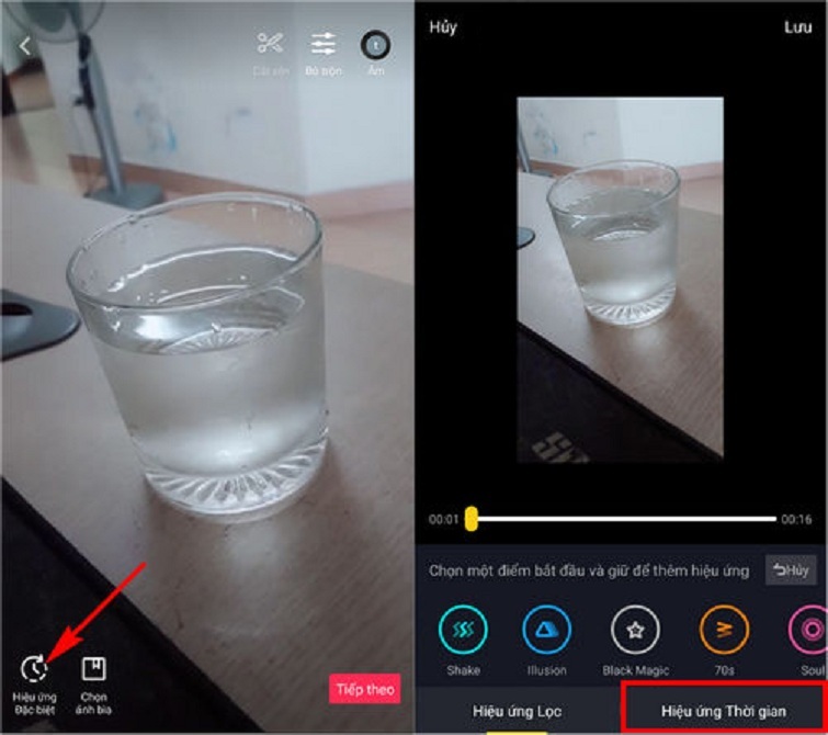 Bước 5 : Khi bạn đã quay video thành công, bạn sẽ tiếp tục đi lựa chọn Hiệu ứng đặc biệt cùng mục Hiệu ứng thời gian. Như vậy để có thể tạo ra video Tik Tok ngược hot nhất hiện nay.