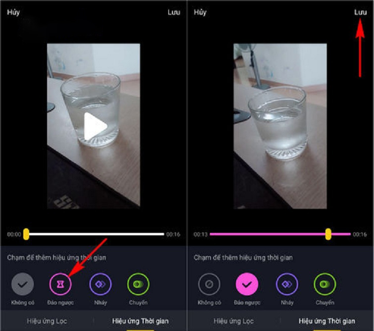 Bước 6 : Lúc này, bạn sẽ tiến hành chọn hiệu ứng Đảo ngược như hình dưới. Hệ thống sẽ hiển thị bản xem thử và bạn có thể ấn chọn Lưu để xác nhận sử dụng hiệu ứng này.