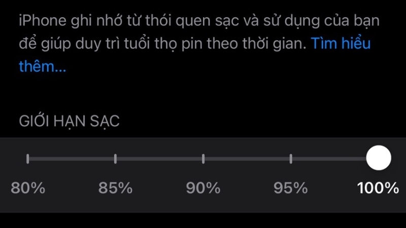 Tính năng mới này cho phép đặt mức sạc tối đa cố định ở 80%, 85%, 90% hoặc 95%. Đây là lựa chọn tốt nhất cho những ai ít khi cần dùng máy cả ngày không có nguồn sạc dự phòng.