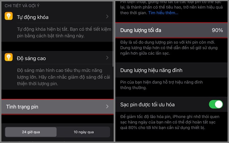 - Dung lượng tối đa: Phần trăm so với dung lượng ban đầu khi xuất xưởng.