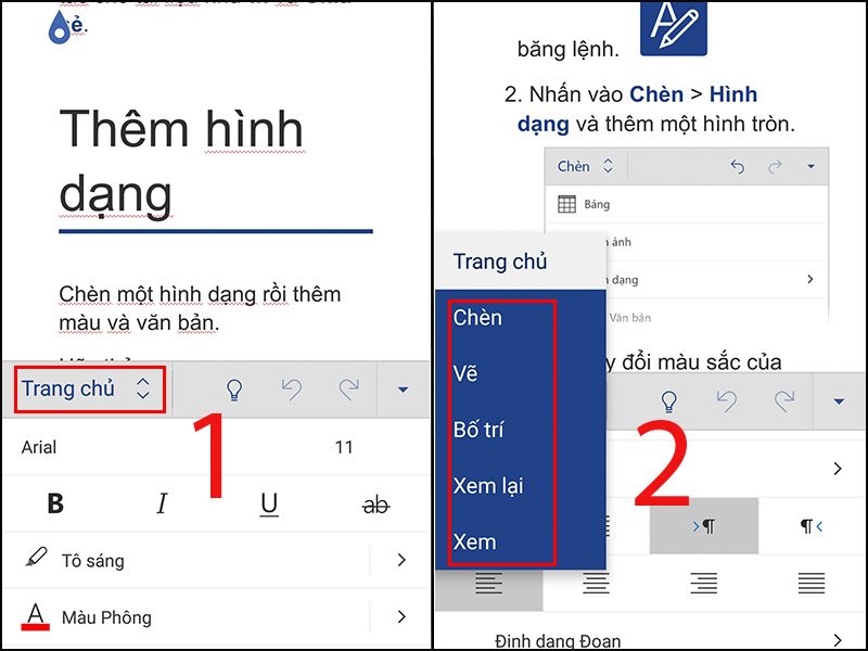 - Ribbon menu được chia thành các tab: Trang chủ, Chèn, Vẽ, Bố cục, Xem lại