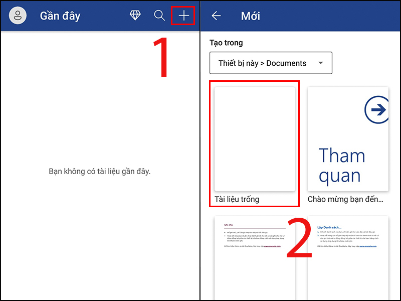 - Tab "Tạo mới": Bắt đầu với tài liệu trống hoặc template