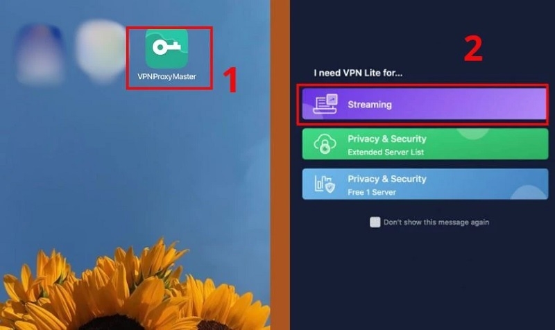 Bước 1: Bạn tải VPN về thiết bị rồi mở ứng dụng lên. Đối với lần đầu sử dụng, khi được hỏi về mục đích sử dụng thì bạn hãy trả lời là Streaming. Hoặc bạn có thể bỏ qua nếu muốn.