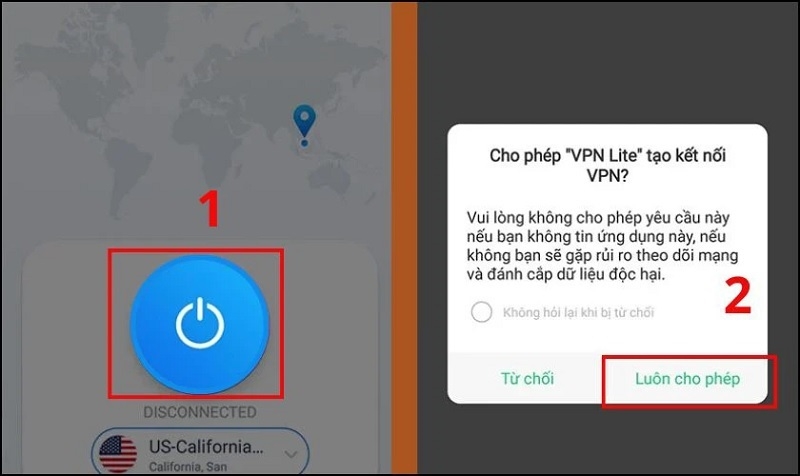 Bước 2: Tại giao diện mới, bạn nhấn vào biểu tượng nút nguồn màu xanh >> Chọn Luôn cho phép để tiếp tục.