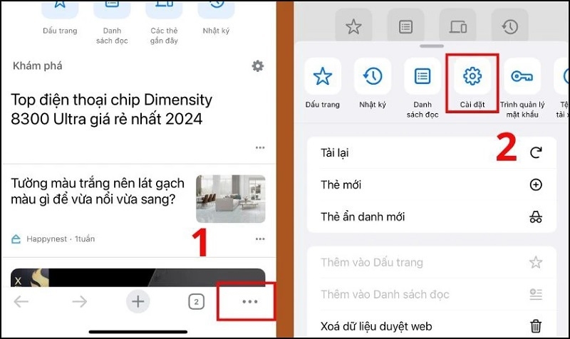 Bước 1: Bạn mở trình duyệt Google Chrome lên trên điện thoại >> Mở tab ẩn danh. Sau đó, bạn lần lượt nhấn vào biểu tượng 3 dấu chấm >> Nhấn mục cài đặt.