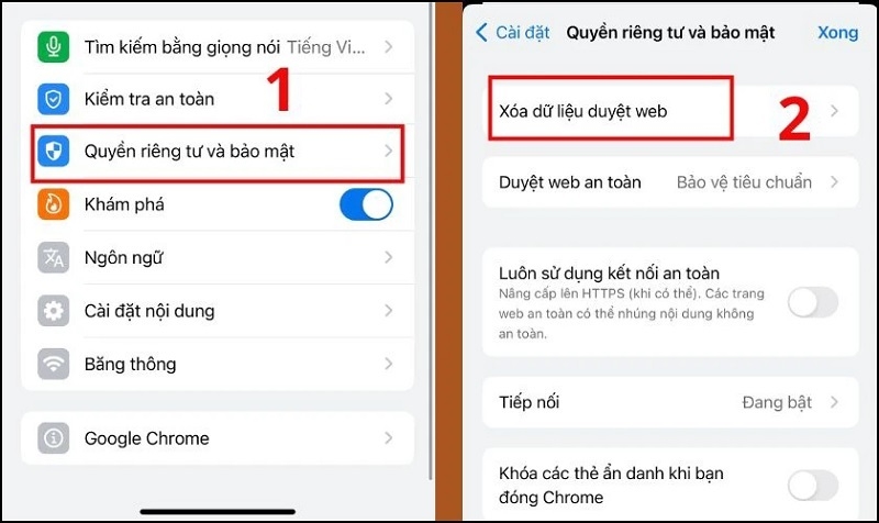 Bước 2: Tiếp theo, bạn chọn mục Quyền riêng tư và bảo mật. Chọn Xóa dữ liệu duyệt Web để tiếp tục.