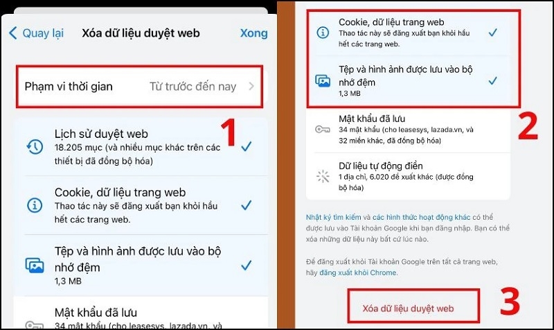 Bước 3: Tại cửa sổ mới, bạn nhấn vào tùy chọn Từ trước đến nay tại mục Phạm vi thời gian. Sau đó, bạn tích chọn tại 2 mục là Cookie và dữ liệu trang web, Tệp và hình ảnh được lưu vào bộ nhớ đệm. Cuối cùng, bạn chọn Xóa dữ liệu duyệt web để hoàn tất.