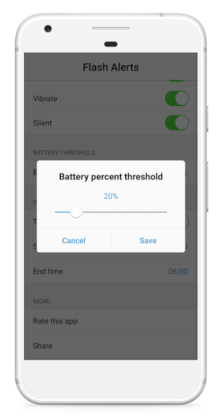 Bạn cũng có thể chọn phần trăm pin mà tại đó tất cả các thông báo flash bị tắt bằng cách nhấn vào "Phần trăm pin" trong Ngưỡng pin và chọn phần trăm bạn muốn bằng cách sử dụng thanh trượt. Điều này sẽ giúp điện thoại của bạn không bị chết máy nếu ai đó gọi cho bạn nhiều khi bạn vắng mặt vì đèn LED của camera có thể làm hao pin khá nhanh.